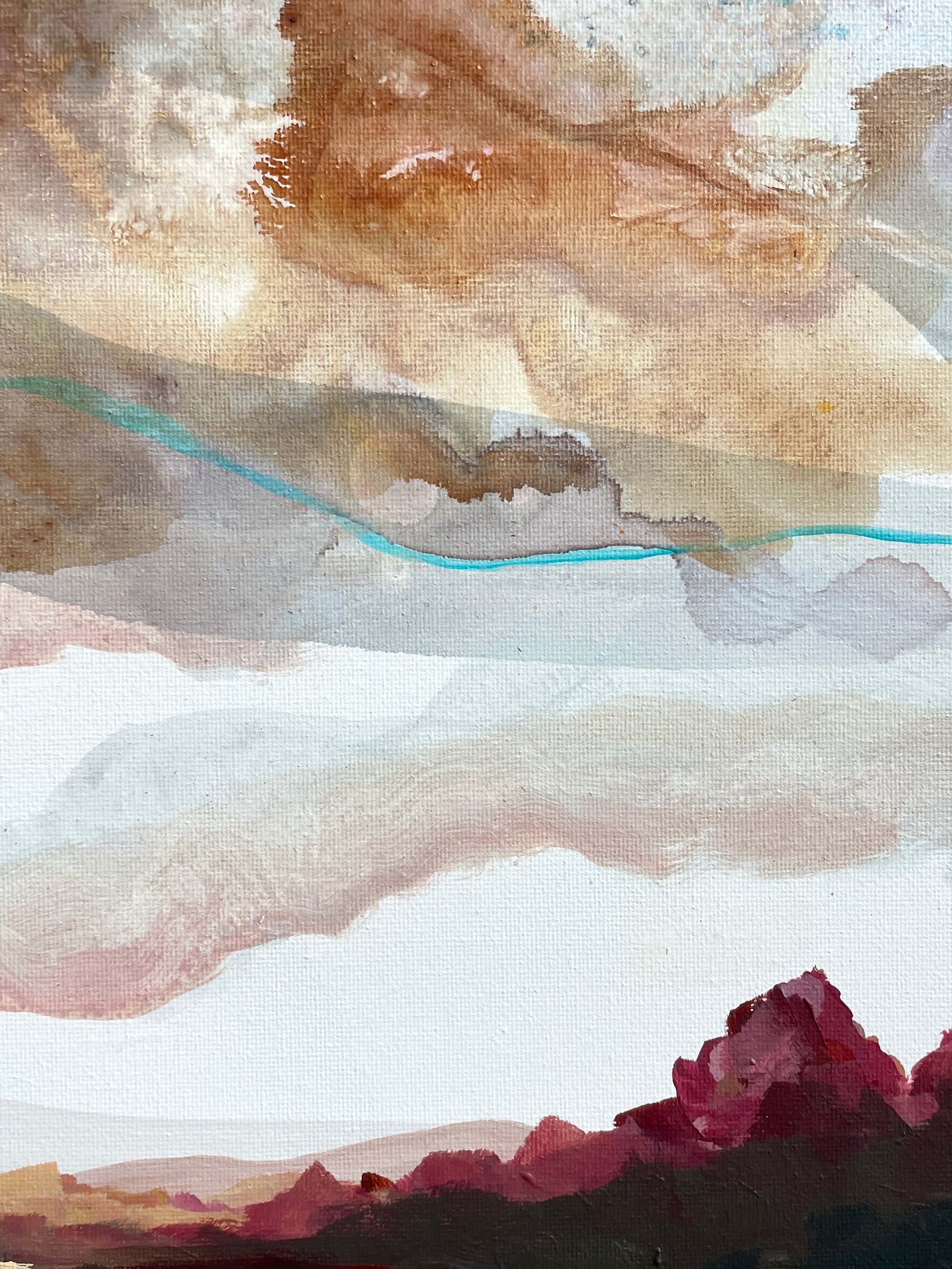 This collection celebrates the beautiful scenery found on my adventures. From high mountain views, through flowered grasslands, to slow moving creeks, there is always something to capture and remember. I aimed to blend realism with abstraction, employing textures and vivid, expressive colors to breathe life into the painting, while subtly infusing it with a touch of imagination.