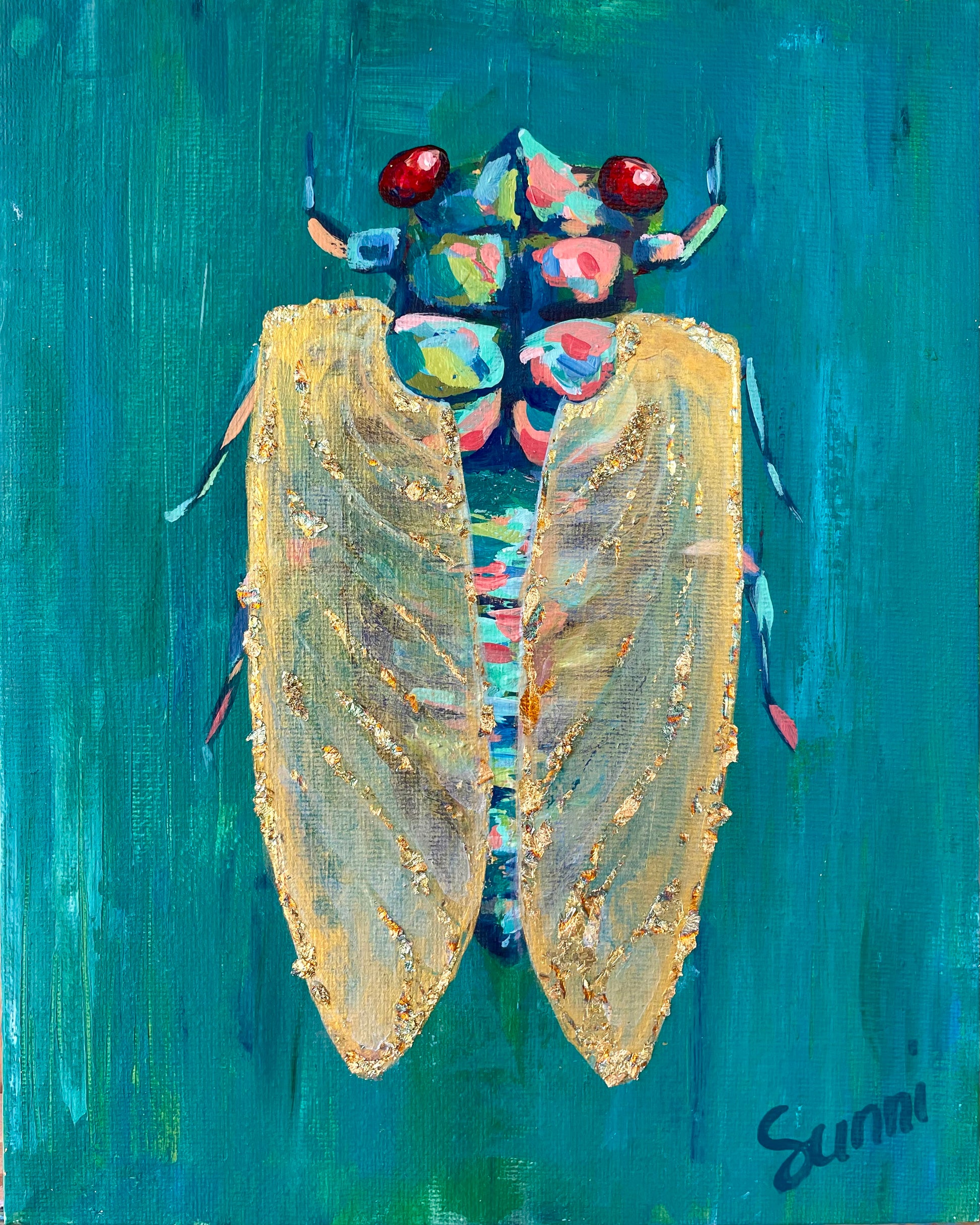 In creating this piece, I sought to celebrate the incredible phenomenon of Brood XIX's emergence and to draw attention to the beauty and complexity of these insects. Through vibrant colors and sparkly details, I aimed to convey not only the visual spectacle of the cicadas but add my own twist. This painting is a tribute to the marvels of the natural world and a call to cherish and protect the delicate balances within our environment.