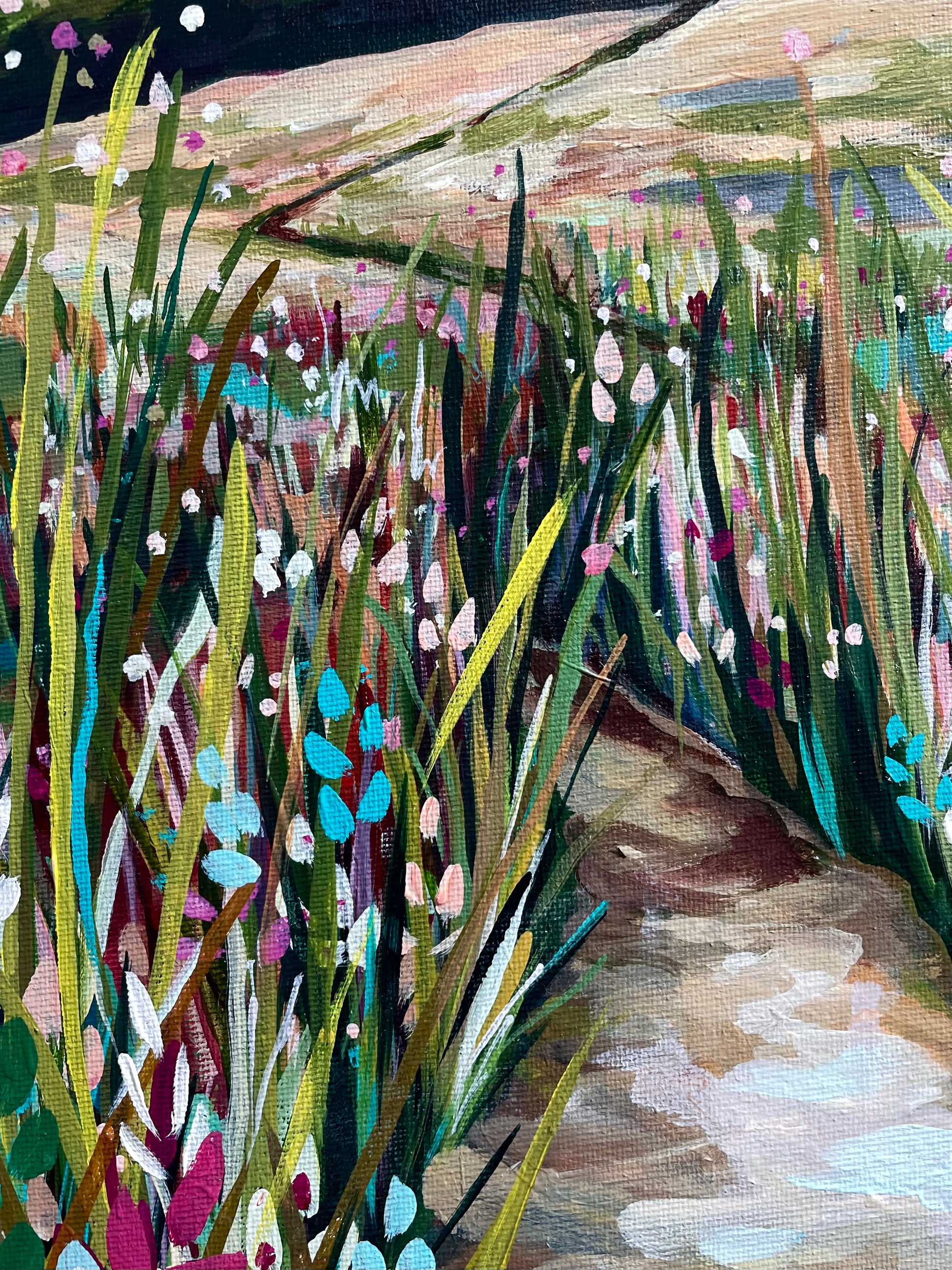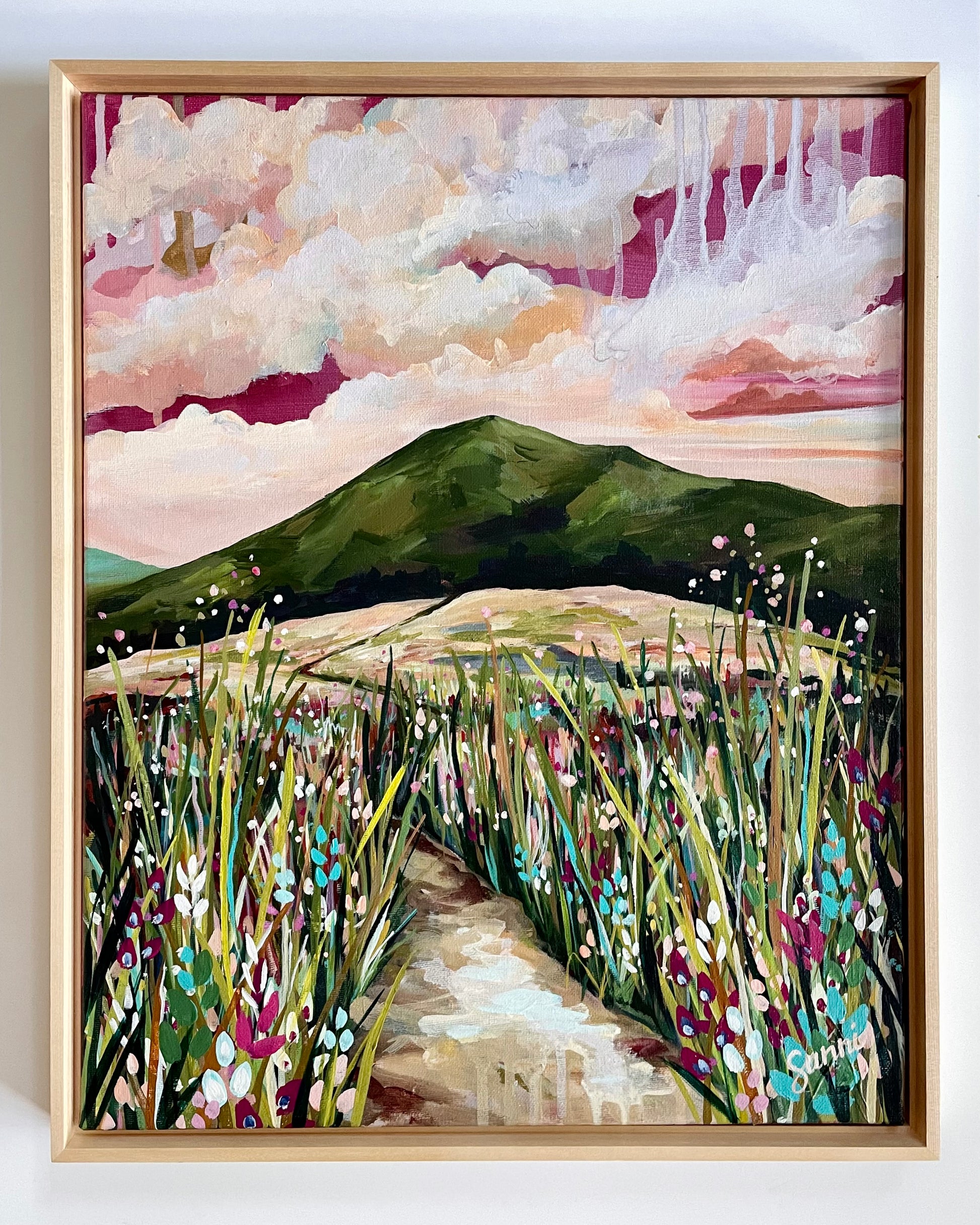 This collection celebrates the beautiful scenery found on my adventures. From high mountain views, through flowered grasslands, to slow moving creeks, there is always something to capture and remember. I aimed to blend realism with abstraction, employing textures and vivid, expressive colors to breathe life into the painting, while subtly infusing it with a touch of imagination.
