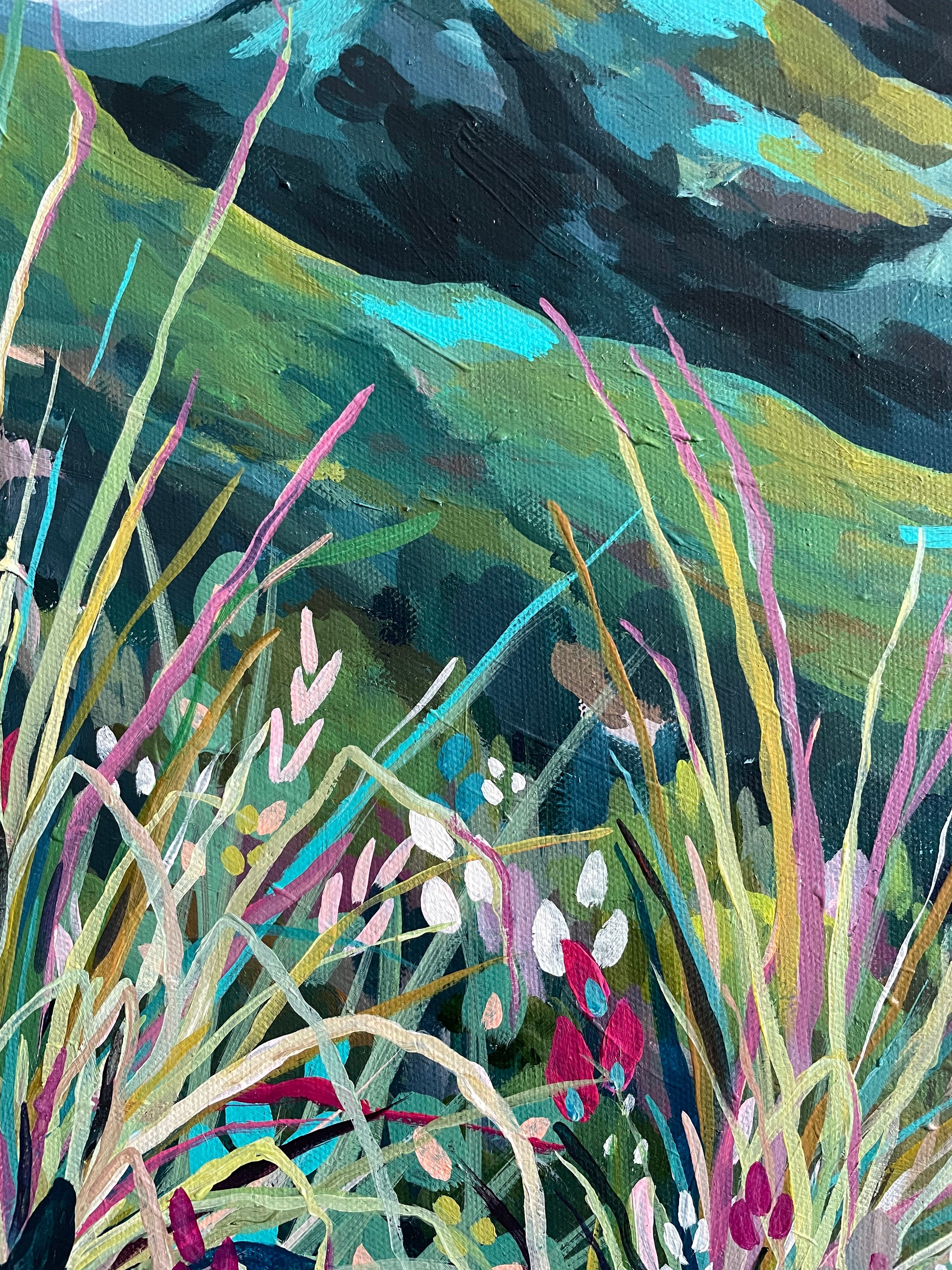 This collection celebrates the beautiful scenery found on my adventures. From high mountain views, through flowered grasslands, to slow moving creeks, there is always something to capture and remember. I aimed to blend realism with abstraction, employing textures and vivid, expressive colors to breathe life into the painting, while subtly infusing it with a touch of imagination.